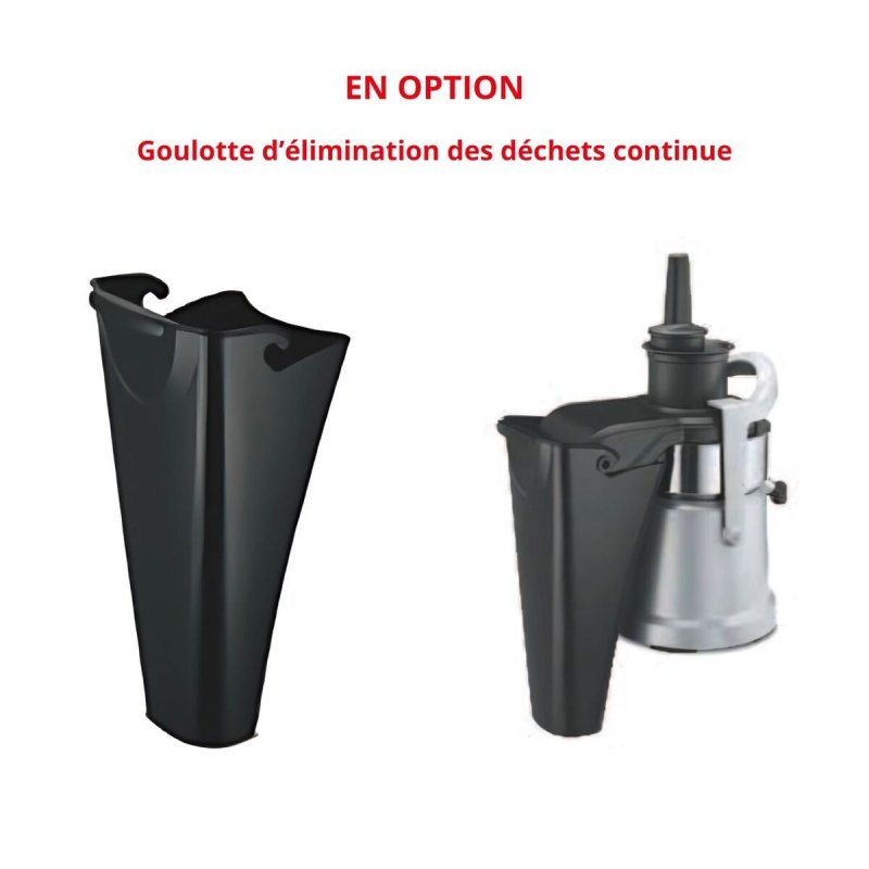 Conçu pour répondre aux exigences des professionnels, il est doté d'un boîtier en métal moulé sous pression, garantissant robustesse et longévité. Le panier filtrant et le disque de déchiquetage en acier inoxydable assurent une extraction efficace et sans effort. Les fonctions de verrouillage de sécurité offrent une utilisation en toute sérénité, tandis que le robinet rotatif anti-goutte permet un service propre et précis. De plus, une brosse de nettoyage est incluse pour un entretien facile et rapide.