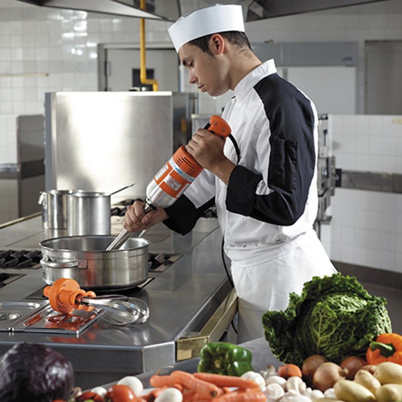Ce mixeur plongeant professionnel est votre allié pour broyer et mélanger avec efficacité dans des contenants d'une capacité de 20 à 40 litres une variété de préparations telles que potages veloutés, soupes de poissons, panades, brunoises, mousselines, hachis de choux et d'épinards, pâtes à crêpes, sauces, mayonnaises, brandades de morue, purées de légumes finement pulvérisées, bouillies, crèmes de fruits, et bien plus encore.
