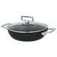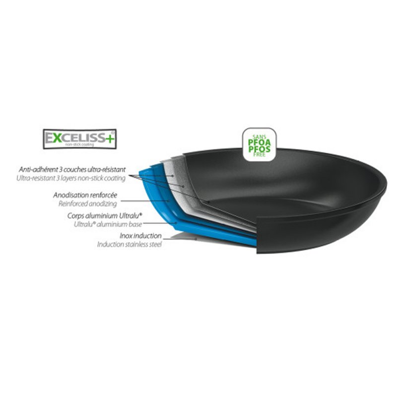 Fabriquée en aluminium avec un revêtement antiadhésif Excellis®+ sans PFOA et sans PFOS, cette poêle convient à tous les feux. Elle dispose de deux anses rivetées en fonte d'inox et d'un couvercle en verre bombé cerclé inox.