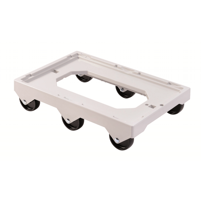 Socle rouleur blanc avec 6 roues pivotantes, supportant jusqu'à 250 kg. Idéal pour bacs et caisses de 600x400 mm ainsi que les...