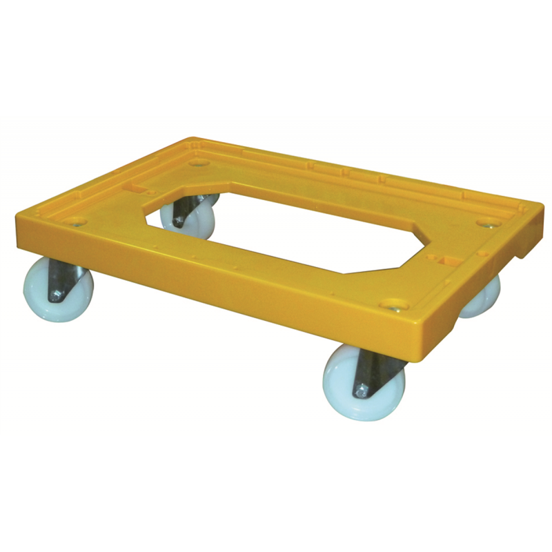 Socle rouleur jaune avec 4 roues pivotantes, supporte jusqu'à 250 kg. Idéal pour bacs et caisses de 600x400 mm et mannes à pain...