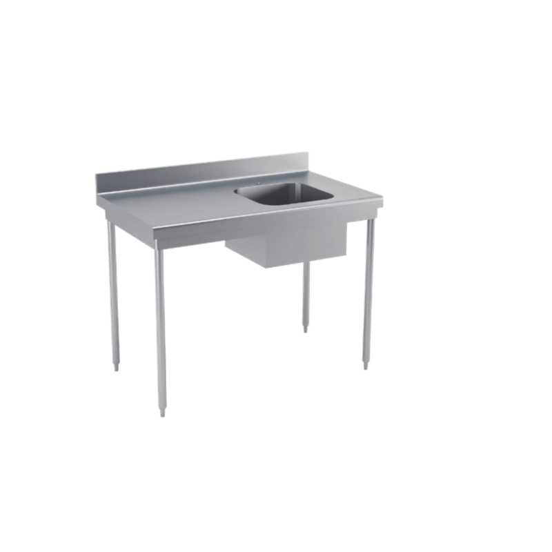 La plonge adossée professionnelle Dora Metal mesure 1800x700x850/900mm et est équipée de deux bacs et d'un égouttoir. Sa construction est entièrement en acier inox 18/10 de type AISI 304. Pour cet équipement professionnel, le plateau, d'une épaisseur de 15/10e, est brossé. Un égouttoir lisse est situé à l'opposé des bacs, avec des bords anti-ruissellement sur 3 côtés. Le bord avant et le bas du dosseret sont rayonnés de 15 mm. La hauteur est de 56 mm sur 3 faces avec un contre-pli. Le dosseret arrière, mesurant 100 x 20 mm, est fermé aux extrémités. Le piétement arrière est décalé de 60 mm. Les bacs sont insonorisés. Le piétement, en acier inox de Ø 38 mm, est soudé sur les caches-bacs et équipé de vérins réglables en acier inox.