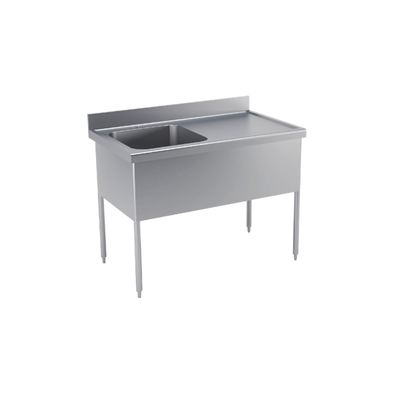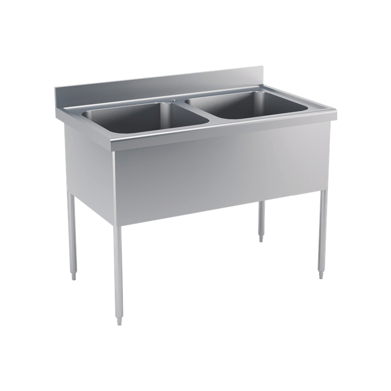 La plonge adossée professionnelle esure 1800 x 700 x 850/900 mm et est équipée de deux bacs de 500 x 500 mm avec un égouttoir à gauche. Cet équipement professionnel est entièrement construit en acier inoxydable 18/10, AISI 304, avec un plateau brossé d'une épaisseur de 15/10e. L'égouttoir lisse est positionné à l'opposé des bacs, et des bords anti-ruissellement sont présents sur trois faces. Le dosseret arrière de 100 x 20 mm est fermé aux extrémités. Les bacs sont insonorisés et équipés de caches en inox d'une hauteur de 410 mm sur trois faces. Le piétement en inox de ø 38 mm est soudé sur les caches-bacs et équipé de vérins réglables en inox pour une stabilité optimale.