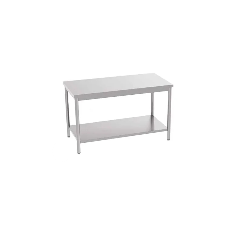 La table centrale en inox professionnelle, avec étagère adossée, a une hauteur ajustable de 850/900 mm et repose sur des pieds ronds de 50 mm de diamètre avec un bord de 40 mm. Le dessus et les piètements sont conçus pour un assemblage facile et rapide. Pour cet équipement professionnel, le plateau est renforcé par un panneau de bois insonorisé et hydrofuge de 18 mm avec un mélaminé blanc double face. Il dispose d'un bord droit de 40 mm et d'un dosseret de 100 mm d'épaisseur soudé et poli. La version adossée inclut un décalage de 60 mm. Les dimensions du plateau sont de 1000 x 600 mm.