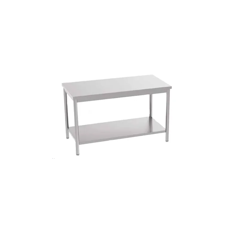 La table centrale en inox avec étagère adossée a une hauteur ajustable de 850/900 mm et repose sur des pieds ronds de ø 50 mm....