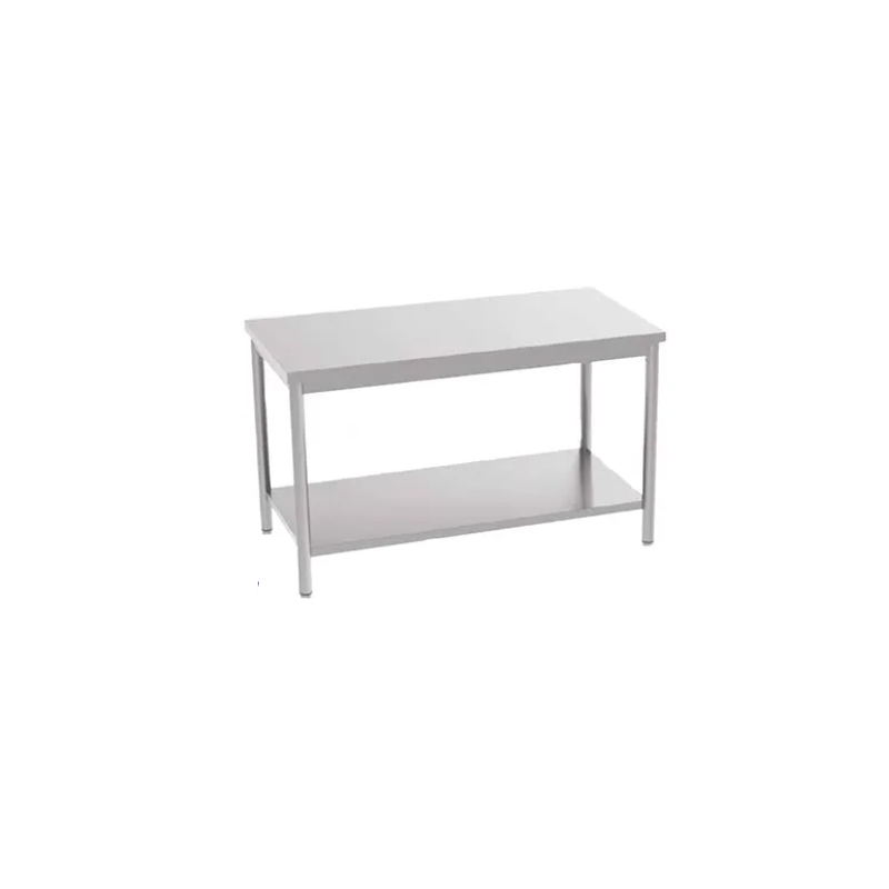 La table centrale en inox professionnelle, équipée d'une étagère, a une hauteur ajustable de 850/900 mm et repose sur des pieds ronds de 50 mm de diamètre avec un bord de 40 mm. Le dessus et les piètements sont conçus pour un assemblage facile et rapide. Pour cet équipement professionnel, le plateau est renforcé par un panneau de bois insonorisé et hydrofuge de 18 mm avec un mélaminé blanc double face. Il dispose d'un bord droit de 40 mm et d'un dosseret de 100 mm d'épaisseur soudé et poli. La version adossée inclut un décalage de 60 mm. Les dimensions du plateau sont de 1600 x 600 mm.