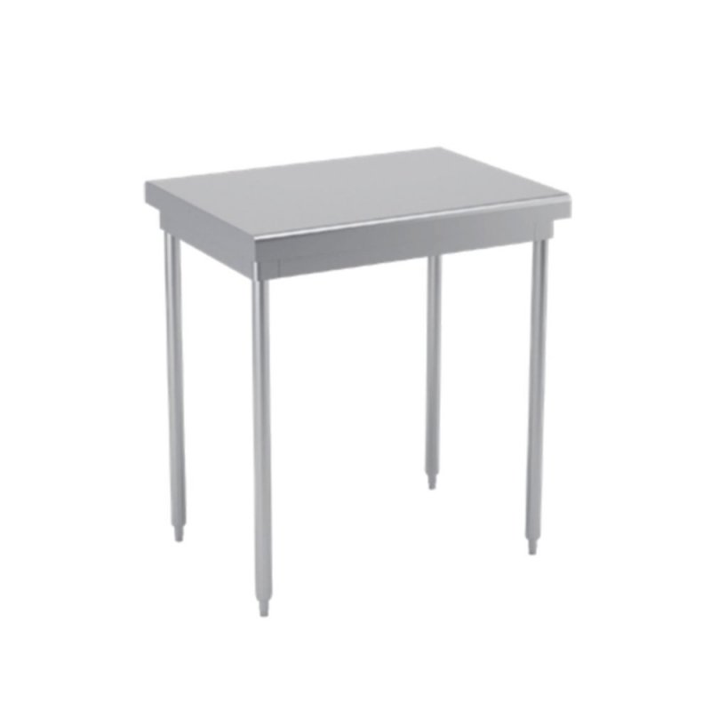 La table centrale professionnelle sans étagère en inox mesure 2000 x 700 x 900 mm et possède un plateau d'une épaisseur de 15/10ème brossé. Fabriqué en acier inoxydable AISI 304, ce plateau est collé sur un panneau mélaminé hydrofuge des deux côtés, d'une épaisseur de 18 mm. Les bords avant et arrière sont rayonnés R15mm, avec une hauteur de 56 mm et un contre-pli. La table est renforcée et rigidifiée par une ceinture en acier inoxydable de 90x30 mm avec des coins en inox. Son piétement est constitué de tubes en inox de Ø38mm, démontable et équipé de vérins inox réglables en hauteur.