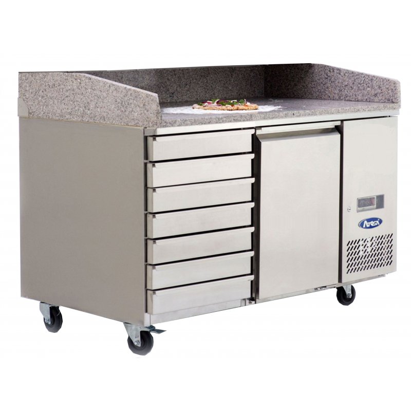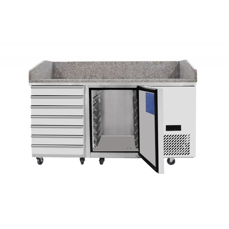 Cette table réfrigérée positive professionnelle spécialement conçue pour les pizzas est équipée d'une porte et de 7 tiroirs à pâtons. Il est important de noter que la colonne de tiroirs n'est pas réfrigérée, et la hauteur maximale intérieure de chaque tiroir est de 70 mm. La structure de la table est entièrement en acier inoxydable à l'intérieur et à l'extérieur, à l'exception de la partie arrière et du dessous qui sont en acier galvanisé. Cette gamme respectueuse de l'environnement, développée par la marque Atosa, utilise des gaz réfrigérants plus écologiques.