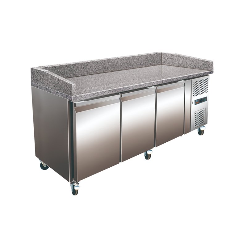 Meuble de préparation à pizza composé de 3 portes, il a une capacité de 635 litres pour une capacité de stockage importante.