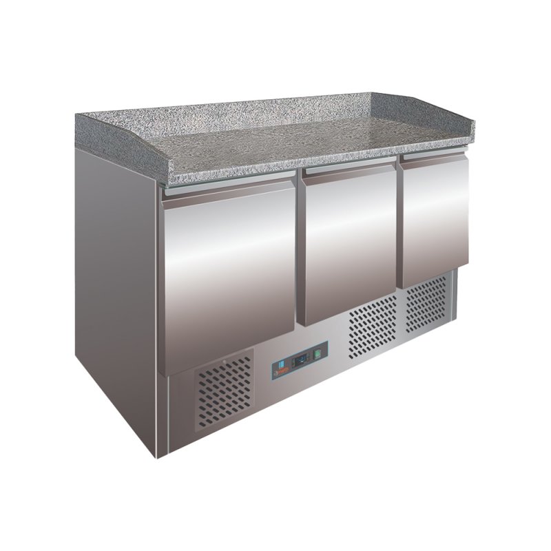 Meuble de préparation à pizza composé de 3 portes, il a une capacité de 400 litres pour une capacité de stockage importante.
