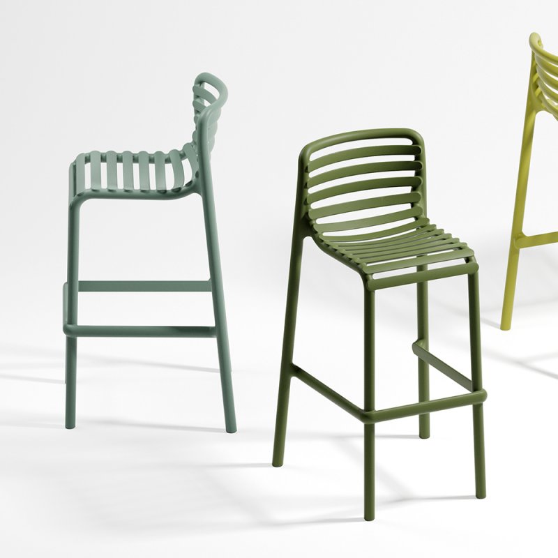 Frais, léger et ergonomique, DOGA est une collection d'extérieur en résine de fibre de verre, caractérisée par un jeu de lattes horizontales, revisitée avec une touche contemporaine.