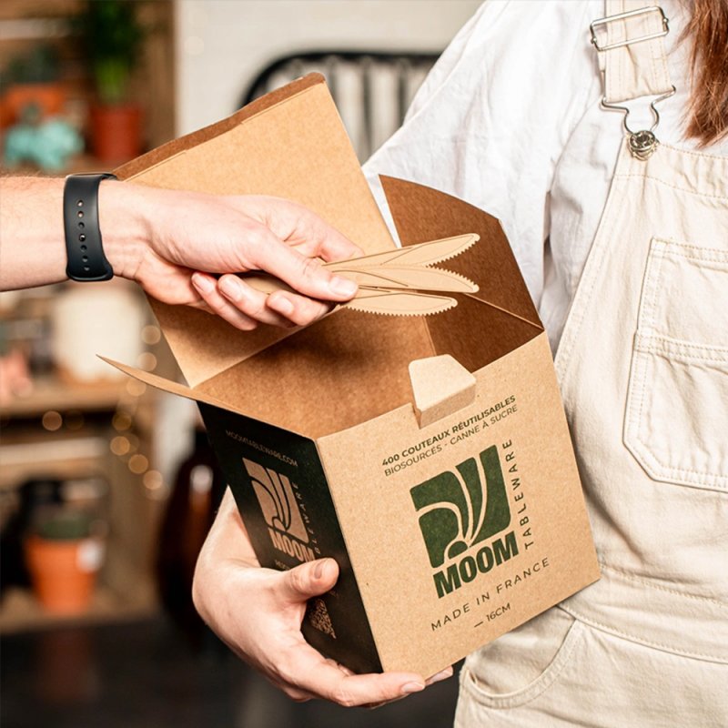 Fabriqués à base de biomatériaux issus notamment de la canne à sucre, ces couteaux de table peuvent être réutilisés au moins 100 fois en lave vaisselle.