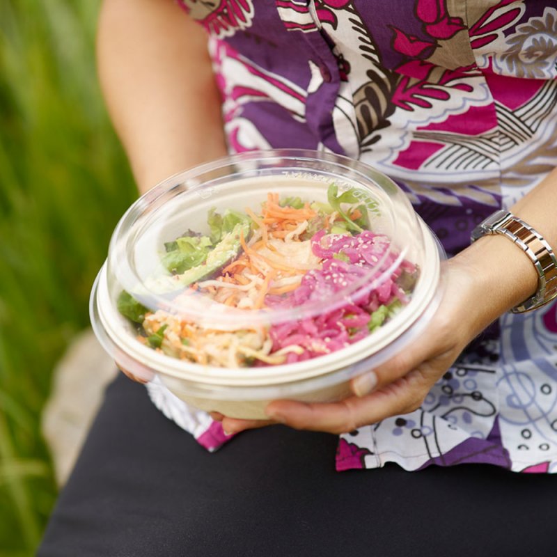 Avec son couvercle ultra-sécurisé et doté d'une fonction anti-buée pour éviter la condensation, le bol en bagasse, devenu extrêmement populaire, convient aux plats chauds et froids. Les couvercles sont 100% PET et résistent jusqu’à 70°C.