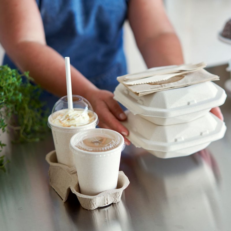 Outre le couvercle en fibre de canne à sucre ultra-sécurisé, les couvercles transparents facultatifs sont composés à 100 % de PET recyclé après consommation (RPET) et se recyclent facilement une fois utilisés. Les couvercles sont 100% PET et résistent jusqu’à 70°C.